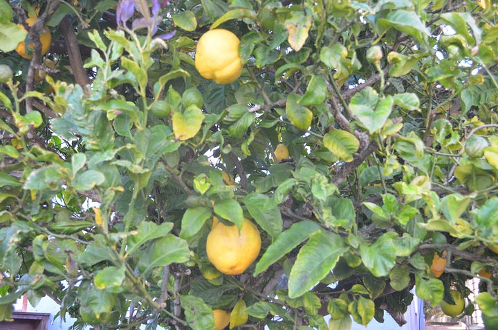 The lemon tree was sturdy and squat—likely planted then tended by Adnan and her wife. But the new owners seemed negligent. Mid-August and the lemons overripe. There must’ve been over a hundred lemons knobbing the branches, skin puffy and thick from neglect.